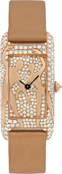 تتميز هذه الساعة بأناقتها الفريدة بذاتها، وتأتي في علبة مزخرفة بالكامل، ومميزة بأنها مرصعة بالألماس والنقوش. إنها ساعة مميزة جدًا، محفورة يدويًا وذات شكل مستطيل، مصنوعة من الذهب عيار 18 قيراط، ومزينة بالأحجار الكريمة المختلفة والألماس. تحتوي على مشبك أرديون من الذهب وحزام من الساتان الأنثوي، وتبلغ قيمتها 25500 دولار أمريكي أو ما يعادل 93661.50 درهم إماراتي.