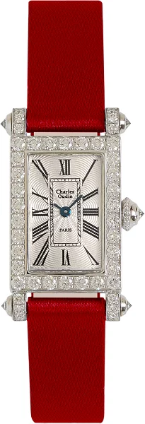 إنها ساعة متطورة من مجموعة ريترو لشارلز أودين، وتعتبر ساعة ألماس شهيرة بين النساء، مصنوعة من الذهب عيار 18 وتتميز بشكلها المستطيل، وزينت بألماس بريانت من الذهب. تحمل ميناء بتصميم تاجي وحزام من الساتان، وتتوفر بثلاثة ألوان مختلفة. وبالنسبة لسعرها، فهو معتدل في تشارلز أودين في الإمارات، حيث يصل إلى حوالي 19200 دولار أمريكي أي ما يعادل 70521.60 درهم إماراتي بدون الضرائب وتكاليف الشحن.