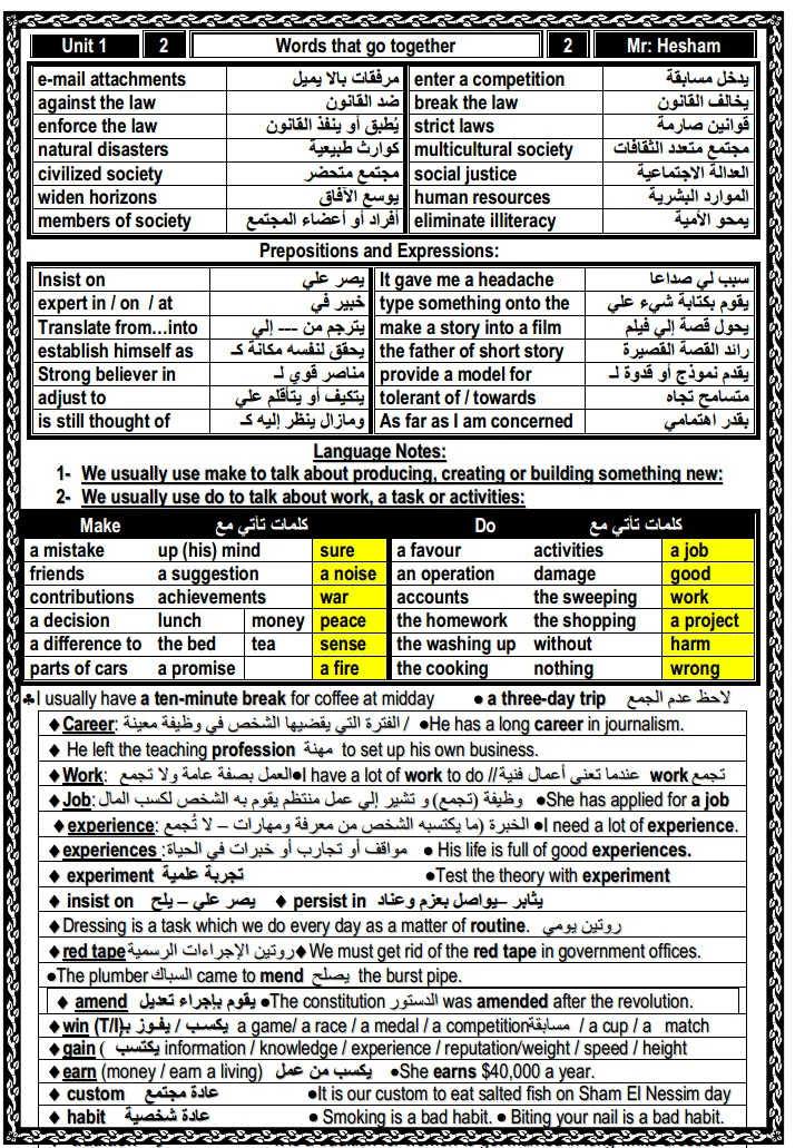 مذكرة لغة انجليزية للصف الثالث الثانوى