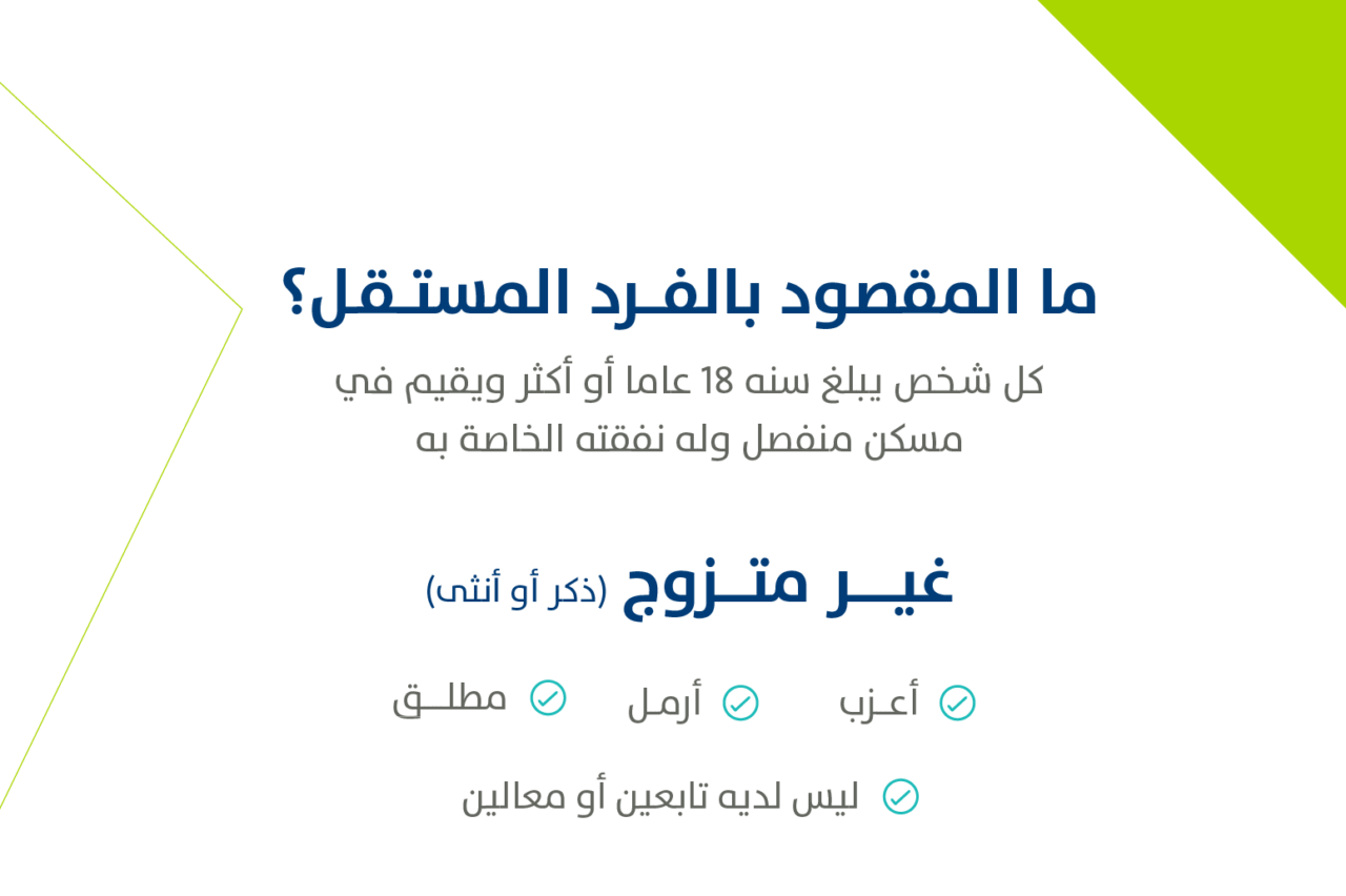 وضع برنامج حساب المواطن شروطًا لكي يتلقى الشخص المستقل الدعم، حيث يجب أن يكون الفرد بالغًا وعمره 28 عامًا أو أكثر، يجب أن يكون عازبًا أو أرملًا أو مطلقًا دون أن يكون لديه أفراد تحت كفالته، وأن يسكن في مأوى خاص به. كما يتطلب البرنامج تقديم دلائل تؤكد استقلالية المسكن، مثل عقد إيجار إلكتروني باسمه، أو وثائق تشير إلى السكن في المدينة الجامعية أو السكن الحكومي أو الخاص أو المعاهد العسكرية، وأيضًا سند ملكية المسكن.