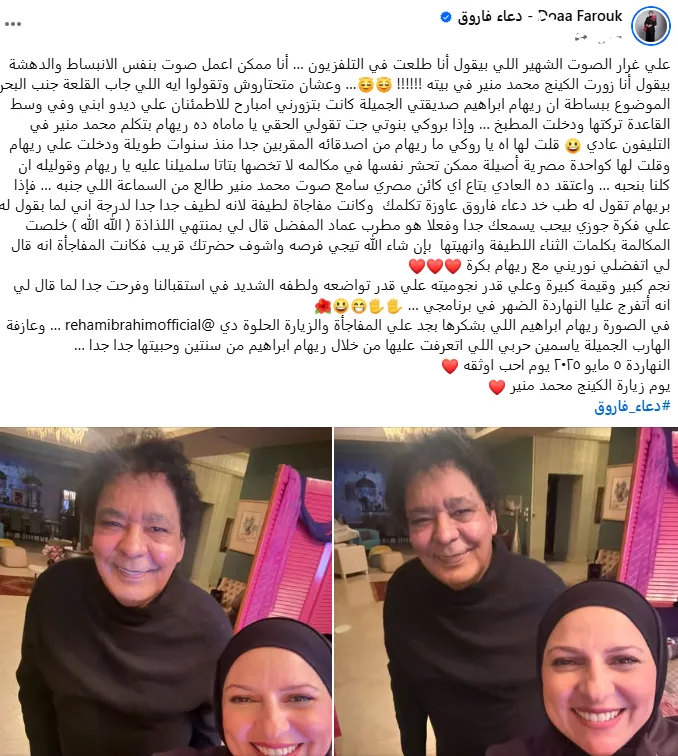 ونشرت دعاء فاروق الصور عبر حسابها الشخصي بموقع التواصل الاجتماعي فيس بوك، وعلى الفور انهالت عليها التعليقات من قِبل جمهورها وكل متابعيها، وعلقت الإعلامية على هذه الصورة قائلة: على غرار الصوت الشهير اللي بيقول أنا طلعت في التلفزيون.. أنا ممكن أعمل صوت بنفس الانبساط والدهشة بيقول أنا زورت الكينج محمد منير في بيته.