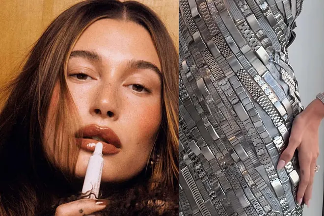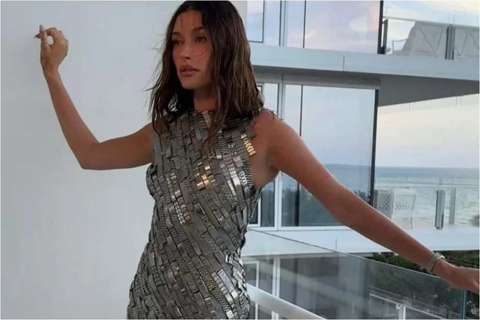 ظهرت هايلي بيبر بفستان قصير مصنوع بالكامل من أحزمة ساعات معدنية معاد تدويرها، وهو تصميم مبتكر من توقيع مصممة الأزياء الفرنسية مارين سير، المعروفة بمزجها بين الاستدامة والخيال المستقبلي.
