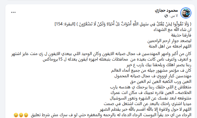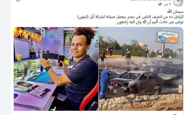 خلال الساعات الماضية، توفي حذيفة صاحب محل إيفيكت لصيانة الآيفون، وذلك بسبب تأثره بالحروق التي تعرض لها بسبب انفجار خط غاز الواحات.
