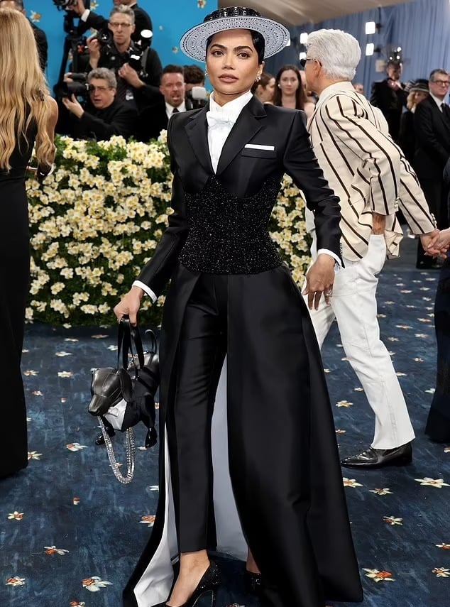 وارتدت مونا باتيل بدلة باللون الأسود، مصنوعة من الستان المرصع، من تصميم مصمم الأزياء الأمريكي توم براون، بالإضافة إلى قبعة مطبوعة بتقنية ثلاثية الأبعاد.