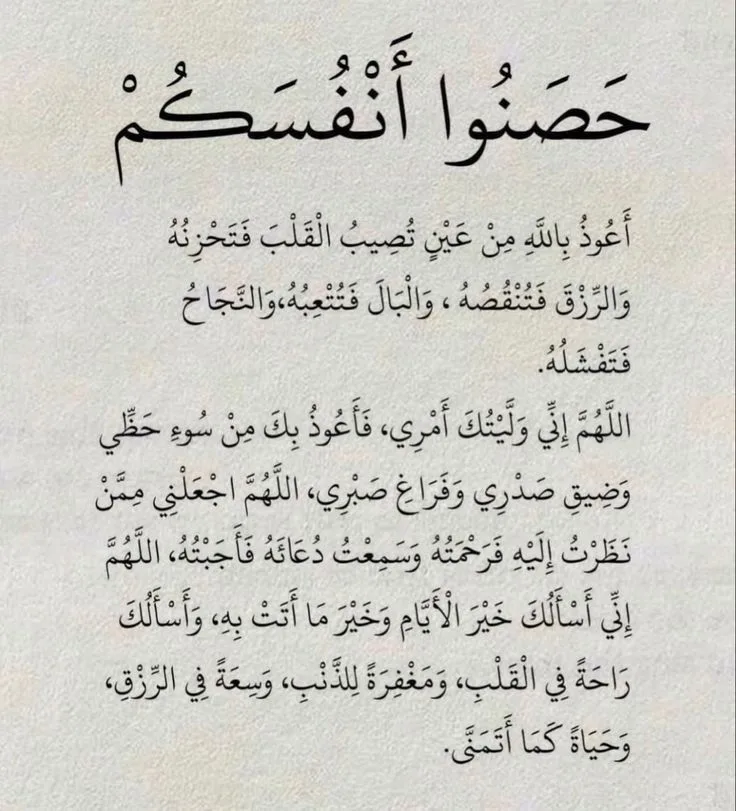 - اللهم إنّي أستودعك كل نعمة أنعمت بها علّي وعندك لا تضيع الودائع. اللهم كُفّ عيون النّاس عنّي، واصرفهم عنّي واجعلهم في أنفسهم مشغولين. أعوذ بالله العلي العظيم من نزغات الشياطين وجنودهم وأعوانهم.